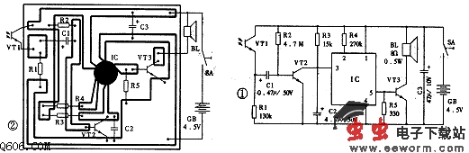 光控语音警示电原理图见图1。整个电路由光控电子开关和3秒语音集成电路两部分组成。图1中光敏三极管VT1和晶体三极管VT2,电阻R1、R2、R3和电容C1、C2等构成光控开关电路。语音集成电路IC及三极管VT3、电阻R4、R5等构成语音放大电路。图2是该电路的印刷电路板图。平常在光源照射下,VT1呈低阻状态,VT2饱和导通,IC的触发端③脚得不到正触发脉冲而不工作,扬声器无声。当VT1被物体遮挡时,便产生一负脉冲电压,并通过C1耦合到VT2的基极,导致VT2进入截止状态,IC获得一正触发脉冲而工作,输出音频信号通过VT3放大,推动扬声器发出声响。声响内容可根据不同场合选择不同的语音电路来产生,例如高压电网或配电房等场所,可选用“高压重地,禁止入内”、“有电危险,请勿靠近”等语音集成电路。