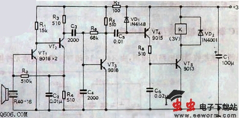 单稳式超声波接收器电路原理图,超声波换能器R40-16谐振频率为40kHZ,经R40-16选频后,将40kHZ以外的干扰信号衰减,只有谐振于40kHZ的有用信号(发射机信号)送入VT1~VT3组成的高通放大器放大,经C5、VD1检出直流分量,控制VT4、VT5组成的电子开关带动继电器K工作。由于该电路仅作单路信号放大,当发射机每发射一次超声波信号时,接收机的继电器吸合一次(吸合时间同发射机发射信号时间相同),无记忆保持功能。可用作无线遥控摄象机快门控制、儿童玩具控制、窗帘控制等。电路中VT1β≥200,VT2β≥150,其他元件自定。电路不需调试即可工作。如灵敏度和抗干扰不够,可检查三极管的β值与电容C4的容量是否偏差太大。经实测,配合相应的发射机,遥控距离可达8m以上。在室内因墙壁反射,故没有方向性。电路工作电压3V,静态电流小于10mA。