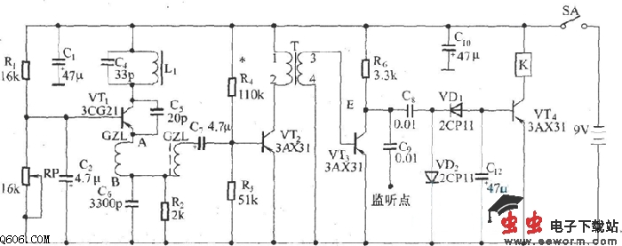 超再生无线电接收器电路图如下所示: