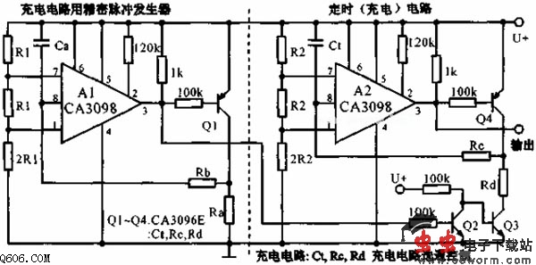小电容长持续时间的定时器电路如下图所示,当需要几个小时的延迟时间,采用两个双输入的精确电平检测器CA3098,不需要使用大容量、低漏电的电容器。如果Rc=22MΩ、RD=100KΩ、CTK只需要16μF,就可以得到延迟时间4小时的定时器。
