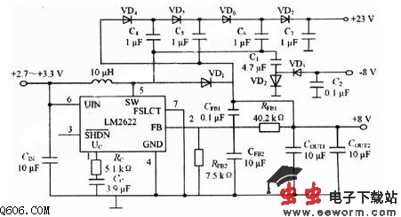 该电路显示了应如何配置LM2622,以提供+8 V,-8 V和+23 V的输出电压,这对于偏置TFT显示器而言是非常方便的。