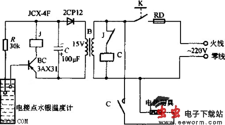工作原理:合上电源开关K,温度低于需要的温度时,电接点水银温度计的两个探针断开,三极管基极开路,因此处于截止状态,继电器不动作,它的常闭点接通C的线圈回路,C吸合,电热器开始加热。当温度升到需要值时,电接点水银温度计中的水银接点接通,使三极管接通,J吸合,C接触器释放,此时电热器断开电源,停止加热。