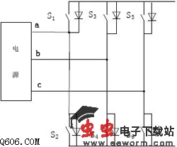 图中的电源用方框标出,在应用中直流电源可能是电压源,也可能是电流源,采用电源不同逆变器输出的特性也不相同。电子开关的开通顺序依照图中的标号1→2→3→4→5→6→1。使三相负载电压为对称的三相交流电。