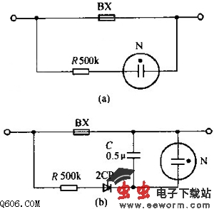 如图所示,保险丝烧断后,可以使图中2A电路迅速显示出来。原理是一旦保险丝烧毁,电压就会通过限流电阻R加在气管两端,使其起辉。如按图B装接,氖管能发出闪烁光,更加醒目。同样道理,如果氖管并接在灯开关上,那么在夜间走入屋内,氖管的亮光将会清楚地告诉人们开关的位置,从而带来很大的方便。