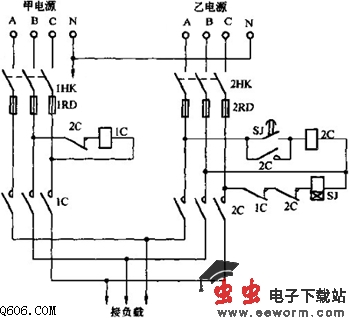 如图所示是双路三相电源自投线路电路。用电时可同时合上刀闸开关1HK和2HK,1C常闭触点断开了SJ时间继电器的电源。向负载供电。当甲电源因故停电时,1C接触器释放,这时IC常闭合,接通时间继电器SJ线图上的电源,时间继电器经延时数秒钟后,使SJ延时常开点闭合,2C得电吸合,并自锁。由于2C的吸合其常闭点一方面断开延时继电器线图电源,另一方面双断开1C线圈的电源回路,使甲电源停止供电,保证乙电源进行正常供电。如果乙电源工作一段时间停电后,2C常闭点会自动接通线圈子1C的电源换为甲电源供电。