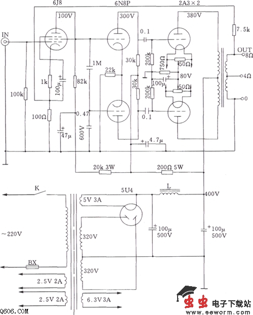 如图2A3A为低内阻直热式三极管,其内阻仅为800Ω,故输出变压一次侧屏至屏的负载阻抗聪3.5kΩ即可。推挽功放管的屏极电压取360~380V,阴极对地电压为60~80V,功放总的工作电流为80~100mA,最大输出功率可达15W。本机失真系数1%~2%,频率响应从20Hz~40kHz±2dB。