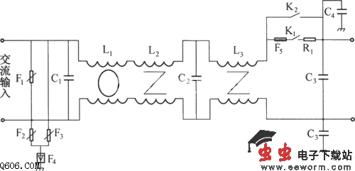 如图所示DMA12单相交流电压经由C3、L3和C1、L2、C2构成的两级差模滤波网络和由与机壳相连的C4、C5和共模电感L1构成的一级共模滤波网络,进行EMI滤波,使EMI滤波后水平输出符合VDE0871 A标准。