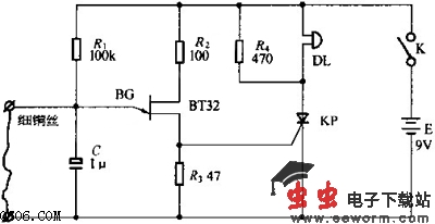 利用如图所示的电路,把非常细的金属丝张拉在门、窗两旁,或者张拉在需要警戒的过道两旁,当有人闯入警戒区时,不知不觉地弄断细金属线,触发BG和可控硅,报警器DL报警。细金属丝可以用0.1MM粗的漆包线。此电路也可用作火情报警,其方法是用一根橡皮筋悬吊一木块,当失火燃烧的热量使皮筋伸长,木块击断金属丝致使报警。