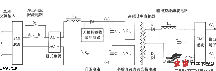 如图所示为简化了的DMA12主电路原理图。它主要由输入电路及电磁干扰(EMI)滤波电路、冲击电流限制电路、输入整流滤波电路、升压/功率因数校正电路及吸收回路、半桥功率变换电路、输出整流滤波电路等几部分组成。与DMA10比较,DMA12采用了单相输入,升压/功率因数校正方式和无损耗吸收缓冲电路,而半桥DC/DC功率变换及输出整流滤波部分则与DMA10一样。
