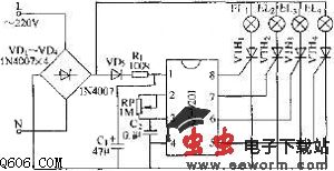 如图所示是用SZ-9201组成的交流彩灯控制电路图。220V交流电源经二极管VD1~VD4作桥式整流,再经VD5隔离、R1降压后由C1滤波。由于SZ-9201内部已设置了电源保护电路及稳压器,所以无需其他稳压电路。由SZ-9201的5~8脚输出的方波脉冲使单向晶闸管VTH1~VTH4轮流导通,从而带动大功率彩灯群闪烁发光。
