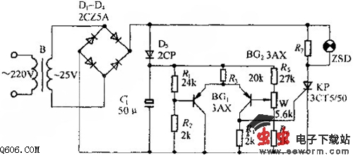如图电路中,用24只300欧,0.5W的电阻并联作为发热元件R7埋在养鱼缸的铺底沙中,用24V灯泡接在加热器两端作通电指示。电阻和联接物用环氧树脂防水。B是电源变压器。养鱼缸温度由热敏电阻R2决定。本设备适用于15KG水的鱼缸。