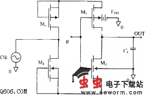 如图所示。M1和M2的连接方式与传统的静态CMOS逻辑电路相似。不同的是电源不再是恒定不变的,而是用一个正弦信号代替,这个信号同时起到同步电路工作的作用,因此又称作电源时钟。M3和M4连接成二极管的形式用来控制充放电的路径。