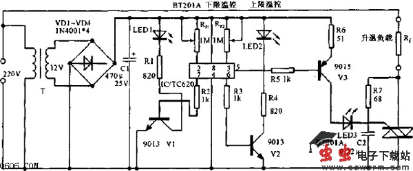 如图所示由内置温度传感器的TC620来控制双向可控硅实现温度控制。调整电路中的Rp1和Rn可分别改变下限温控点及上限温控点,LED1点亮表示环境温度超过下限温控点,LED2点亮表示环境温度超过上限温控点。双向可控硅BCR的额定工作电流的选取可根据实际被控负载功率大小而定。