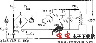 工作原理:电容器C1~C4组成桥式检测电路,并接入220V交流市电中,由于四个桥臂的电容值相等。所以A、B两点对地电位保持平衡,VD1~VD4组成的二极管桥式整流器没有电信号输出。当人体接近金属片A或B时,人体与它们之间形成的电容Cx被并联到电容式桥臂上,使之失去平衡,整流器有交流输入,则输出一个直流信号。此信号电流注入晶体管VT1的基极,经VT2、VT3放大后,带动继电器K动作。利用此继电器的触点控制需要控制的电路,达到接近开关的目的。