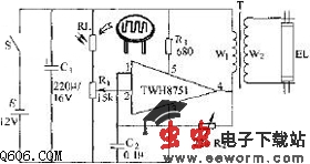 如图所示是光控升压电路。电路常用于应急自动照明灯。当电网突然停电,光敏电阻器RL就会因失去灯光光照而呈高阻状态,使TWH8751集成电路的2脚处于低电位,由TWH8751等组成的振荡电路工作,其4脚输出一系列脉冲电流,经变压器T升压后,点燃日光灯管EL,实现了电网停电后的自动照明。