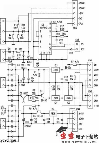 从图中可以看出,电源接通后,IC3输出非受控+5V电压,供CPU CXP84124及HD74HC123工作。74HC123为单稳态触发器,在CS端触发脉冲的作用下,输出复位脉冲,使CPU复位。CPU复位后输出SW控制信号,这时Q1、Q2、Q3才导通,输出+5V、+8V、+10V电压,机器转入自检状态。