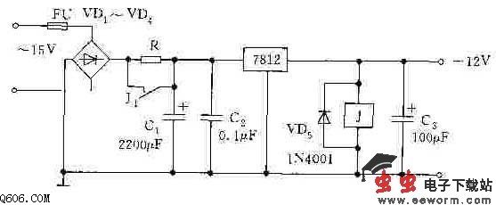 如下图所示,下图是采用继电器等构成的启动电路。在电源输入端接入电阻R,R的作用有二种,其一:可防止开机时对大电容C1的冲击电流而影响电源本身;其二:使负载获电延时数秒。在此过程中,因输出端的继电器J达不到12的吸合电压,合R接入电路起限流降压的作用,随着电源对C1、C3的充电完毕,继电器J接点吸合短路了R,这时,电源才进入正常的工作状态。