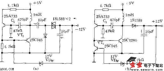 下图是采用晶体管构成的小功率DC/DC变换器电路。其中,图(a)是把+5V输入电压变换为-12V输出电压的电路,图(b)是把+5V输入电压变换为+12V输出电压的电路。对于任一电路,若输出电压超过稳压管VDw的稳定电压,就对驱动晶体管VT1施加负反馈,使输出电压保持恒定。因此、输出电压等于稳压管的稳定电压,若改变稳定电压就可以输出电压进行调节。