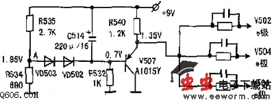 由V507, VD502,VD503, R534, R535, C514, R540组成的有源滤波器即为V502, V504, V506的射极静态偏置电压跟随电路。R535,R534组成分压网络,分压点电压1.85V经VD503串VD502降压至V507基极,约为0.7V,其射极电压约为1.35V左右,作为共射放大器V502, V504, V506三只放大管的射极偏置电压源。共基极放大器的基极偏置电压直接由+9V电源提供,共基极放大管的基极经C513交流接地,因此就输入、输出信号而言V501、V503,V505为共基电路。采用V507(PNP型管)作为视放共射放大器的射极静态偏里电压跟随器,是因为视放共基极放大管V501, V503, V505的基极都接在+9V电源端点上。电源电压稍有变化,就会影响其静态工作点,使输出管静态集电极电位变动而影响荧屏的亮度。为此,采用图中的电路,使共射放大器射极偏置电压跟随+9V电源微量的变动而同步变动,即+9V电源略有变化时,V502, V504,V506发射极电压跟随变化,确保共射、共基两只晶体管不随电源微量变动而变动,也就是说V501, V503, V505的集电极静态电位不变。这一方面可保证大批量产品性能的一致性,也可确保单机亮度不受电源电压微量变化的影响。VD503, VD502结电压(0.5-0.7V)随温度上升而减小,使V507射极电位上升,可补偿视放共射、共基级联放大器两只申联晶体管随温度上升而增加,造成静态工作点变化的影晌,使视放末级大器的温漂减小、工作稳定性大大提高。