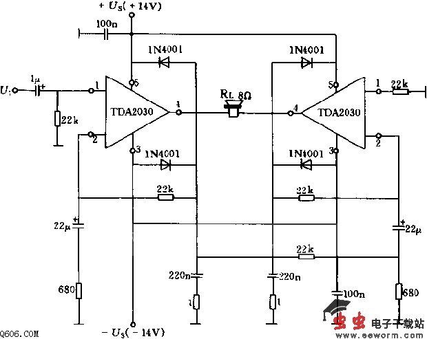 该电路采用两片TDA2030,连接成桥式电路,两边电路结构和参数完全相同。右边的集成电路由左边集成电路通过22k欧负反馈电阻控制,反之亦然。二极管1N4001用于防止扬声器电感负载产生过电压损坏器件。电路的放大系数可通过改变输出端(脚4)至反相输入端(脚2)间负反馈电压比来调整。