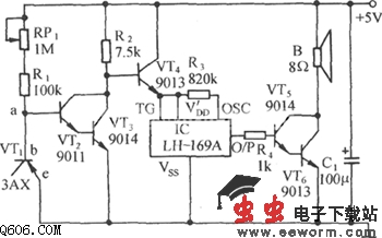 电路如图所示。它由温度传感器、温控电子开关和语言发声电路所组成。在夏季高温季节,PC机上的中央处理器CPU常出现过热现象,将该电路中的VT1的管芯紧贴在CPU芯片的散热器上,一旦CPU过热,电路就会发出“请注意温度”的告戒语句,提醒使用人员采取降温措施。