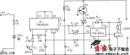 如图所示电路,包括过零驱动开关、光电耦合型输入电路、可控硅控制电路和音响发声电路等。图中的光电三极管开关电路接在TWH9205的差动开关放大器的反相输入端(9脚),当该端的电压低于正相输入端的钳位电压时,即当光电管3DU5受光照射时,TWH9205在交流过零时才输出高电平,驱动可控硅VS并导通,插座XS得电,与XS连结的电气设备投入运行。VS可根据电气负载的功率大小,选用1~500A的双向可控硅。