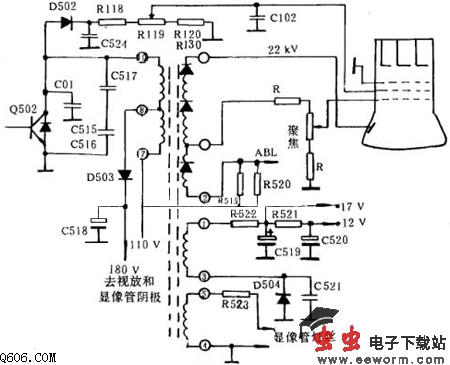 如图是海燕CS37-2型彩色电视机的显像管馈电电路图。 灯丝电压由行回扫变压器④、 ⑤绕组经限流电阻R523供给。 加速极电压则由D502对逆程反峰脉冲整流, 经C524滤波后由R118、 R119、 R120、 R130分压后供给, 高节R119可调节电压的大小。 聚焦极电压和阳极高压由多级一次升压绕组供给, 其中在三分之一处抽头, 经电阻分压后供给聚焦极。 聚焦微调电阻也封在变压器里, 只露一个旋柄在外。 聚焦电压由一根高压引线直接引到显像管管座的聚焦极引出端且封闭较好。