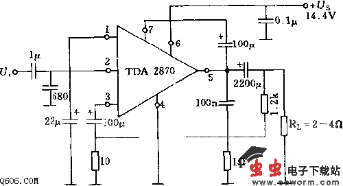 该电路特别适用于汽车收音机电路中,内部有热过负荷保护和短路保护措施。负载电阻2欧,输出功率达10W,供电电压范围为5~18V。