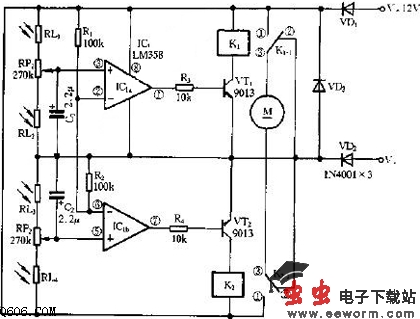 如图所示,双运放LM358与R1、R2构成两个电压比较器,参考电压为VDD(+12V)的1/2。光敏电阻RT1、RT2与电位器RP1和光敏电阻RT3、RT4与电位器RP2分别构成光敏传感电路,该电路的特殊之处在于能根据环境光线的强弱进行自动补偿。如下图所示,将RT1和RT3安装在垂直遮阳板的一侧,RT4和RT2安装在另一侧。当RT1、RT2、RT3和RT4同时受环境自然光线作用时,RP1和RP2的中心点电压不变。如果只有RT1、RT3受太阳光照射,RT1的内阻减小,LM358的3脚电位升高,1脚输出高电平,三极管VT1饱和导通,继电器K1导通,其转换触点3与触点1闭合,同时RT3内阻减小,LM358的5脚电位下降,K2不动作,其转换触点3与静触点2闭合,电机M正转;同理,如果只有RT2、RT4受太阳光照射,继电器K2导通,K1断开,电机M反转。当转到垂直遮阳板两侧面的光照度相同时,继电器K1、K2都导通,电机M才停转。在太阳不停地偏移过程中,垂直遮阳板两侧光照度的强弱不断地交替变化,电机M转-停、转-停,使太阳能接收装置始终面朝太阳。