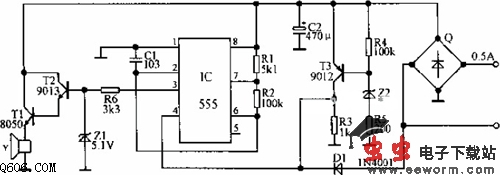 如图所示,555和外围元件构成多谐振荡器,振荡器的工作与否由555的4脚控制,当4脚高电平时,振荡器工作。T3、Z2、R3~R5构成过压检测电路。若Z2击穿,则T3饱和导通,555的4脚得电,振荡器工作驱动扬声器报警,说明此时充电器接线柱上的电压超过设定值。D1为电池反接检测,当电池极性接反时,电池正电压通过D1直接加到555的4脚,电路报警。