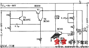 该电路只调节同总电压变化量有关的输出电压的一部分,总电压由U11和U1两部分组成,其值比晶体管T1的极限电压值Uceo max要高。电路有短时过载保护功能,两部分电压源必须有能承受最大负载电流的能力。