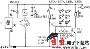 如图所示电路,是由压电式料位传感器、继电器控制电机电路、双音铃发声电路和三相电机组成。这是一个控制三相电动机运行向储料罐运料的电路。IC1采用压电式料位传感器集成电路。