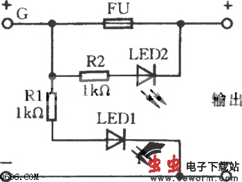 电动机等电气设备常用熔断器作过电流和短路保护。可是,当熔断器熔断后却不易及时发现。如图所示电路能及时告知熔断器熔断。这是用于直流电源的熔断指示器。当电源输出正常时,电流通过R1、LED1发光,它不仅表明负荷在正常工作,而且表明电源极性正常。此时,LED2被熔丝短路而不发光。当熔丝熔断后,电流通过R2使LED2发光,指示熔断器出现故障。