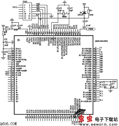 MSP430FF449D单片机主控电路如图所示,主要由MSP430F449芯片、JTAG接口电路、时钟发生电路、时钟输出电路、复位电路、PWM波输出电路、供电电路等组成。其中JTAG用于下载和调试程序,PWM波输出电路用于控制气泵。当测量血压时,先充气至200mmHg高,再慢慢以每秒约下降5mmHg的速度放气。实现自动测量血压。