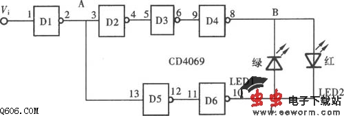 逻辑笔也称逻辑检测探头,它是数字电路中检测各点逻辑状态的常用工具。数字电路中的逻辑状态一般分三种:即高电平“l”、低电平“0”和“高阻态”(悬空)。逻辑状态的测试结果可由发光二极管来显示,也可用发声器来提示,还可用数码发光二极管来显示。如图所示为利用六反相器CD4069与发光二极管组成的逻辑检测笔。