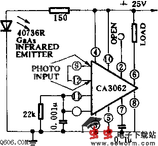 CA3062组合式光电探测器和功率放大器,可响应于光信号而产生通/断输出。集成电路中的输出晶体管应该饱和或者截止,避免在硅片中产生温升。当红外发光二极管的光线照射到集成电路的光输入法端时,互补输出可以选择常通或者常断的负载。阻断光路后产生相反的负载状况。