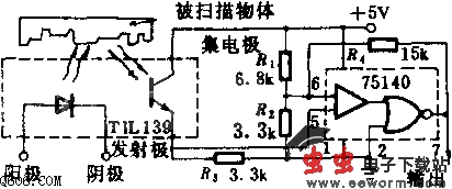 本电路主要包括TIL139源/探测器组件和75140线路接收器,可应用于对反射光或者中断的光作出反应。采用5V电源,输出处于标准的TTL电平。为了使灵敏度可以调节,在R1和R2之间插入500欧电位器,把75140的7连接到3,并且从1取得输出,则可颠倒输出极性。