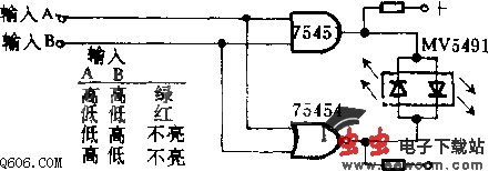 如图所示。若输入A=B=“1”,则绿色LED发光。若A=B=“0”,则红色LED发光。若A,B中一个是高电平,另一个是低电平,则指示灯全不亮。本电路可用于监视复杂的逻辑电路。MV5491是红/绿双LED。电源为+5V,但上面串接的电阻为220欧,下面串接的电阻为100欧。