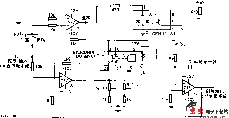 本电路采用Siliconix DG387CJ固体电路继电器,产生从上斜坡到下斜坡的切换,当伺服机构处于新的零位时,使之减速。斜率取决于R1和R2的调节位置。这种电路安排,以低的成本保证了最佳的伺服机构系统响应。A1检测到输入信号不是零,则启动光电隔离器A3,使A4切换。A5产生的正向斜坡使系统负载朝向需要的位置移动,使伺服机构的反馈电压抵消控制输入电压。当这个电压降低到离地电位0.7V以内时,A1输出“0”,A3截止。A4启动下斜坡波形,使系统减速直到停止。对于20V/s的斜率,取C=0.33uF,R3=1.8M欧。