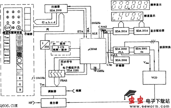 这一系统采用微处理器8048控制,可以精确地显示频道数和频率数值,并可方便地由产生一种标准图形转换到产生另一种图形。