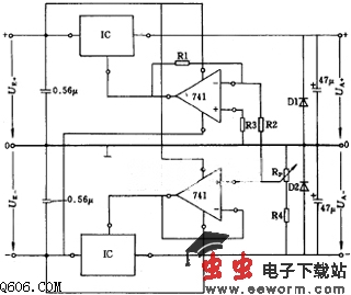 为使正负电压调节同步,在该电路中应有R1=R2。实际取4.4~22KΩ(1~0.5%)。R3值取R3=0.5R2。电位器电阻值在10~25KΩ时限流电阻R4取1.8KΩ。当集成稳压电路稳压值为5V时,该电路输出电低电压也为5V。最高输出电压相当于UE-2V,故同集成电路允许的输入电压有关。