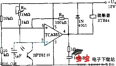 如图利用桥式输入电路的光敏晶体管BPY62和功率运算放大器可以控制功率达8.5kW的负载通断。两个10k欧电阻构成的分压器中点接运算放大器的反相输入端,从而使放大器的翻转电压为1/2Us。利用电位器可以在10~10四次方lx范围内调整开关灵敏度。电阻Rh决定开关滞环的大小。电路的输出由接触器线圈控制。