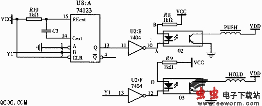 如图为开关电磁铁的驱动电路,其中器件U8是74123芯片,器件02、03是固态继电器,线圈PUSH是开关电磁铁的吸入线圈,HOLD则是其维持线圈,电源VDD为24V。当然转换机构转换到双燃料工作状态时,从74123的B脚输入的Y1从低电平向高电平跳转,迷种变化会让74123的输出端Q输出一个瞬时的高电平脉冲电流,维持时间为ΔT。经反相器7404后,A点的电势UA将会出现同样脉宽的低电平,固态继电器02的输入端也有ΔT时间的电流通过,这时固态继电器02的输出端出现ΔT时间的导通。在这段时间内,很强的吸入电流通过开关电磁铁的吸入线圈,产生足够的电磁力吸入电磁铁的铁芯。脉宽ΔT的选择应该参考开关电磁铁的性能参数设定,既要满足吸入铁芯的要求,又不能太长导致线圈烧毁。
