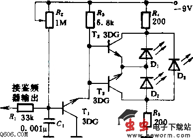 该电路调试的关键在T1的工作点,可用毫伏表监测鉴频器直流输出,使接收机准确地调谐于某调频电台,再改变R2使D3达到最亮。