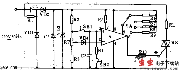 工作原理如图所示。图中,SBl为起动开关,sB2为停止开关。当按下起动开关SB1后,直流电源经R2对电容c3充电,集成运算放大器A同相输入端3的电位高于反相输入端2,A输出高电位去触发双向晶闸管VS,使V5导通。交流电源经VS加至用电负载,定时供电开始。当释放SBl后.C3经A同相输入端放电,放电时间的长短决定于c3的容量和电阻R6一R9的阻值大小以及A反向端②电位的高低。当c3电位下降至反向端电位以下时,A输出接oV,v5无控制电压而截止,定时供电结束。
