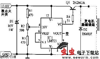 如图是LM723组成的固定电路汽车稳压器电路,它可代替汽车中利用发电机系统组成的机电式充电稳压器,性能优于后者。它使12V的铅-酸电池不致充电不足或充电过量,因而延长了电池的寿命。电路中LM723用作开关稳压器,用于控制发电机的励磁电流。R2的阻值要经过调节,使得充电电压能够维持在汽车标准电池的满电压13.8V。Q1为2N2063A(SK3009)、10A、PNP三极管。