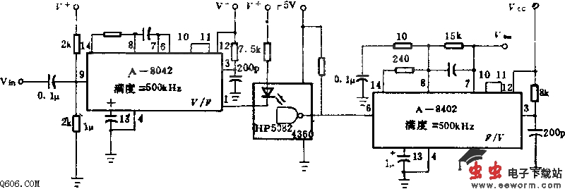 如图所示。本电路使用的A-8402V/F变换器组件,其线性为正负0.05%,最高转换频率高达500kHz,用以驱动光电隔离器的发光二极管。另一只A-8402V/F组件,把光电隔离器的输出,变换为成比例的直流电压。所用电源为12V,也可采用5~18V。