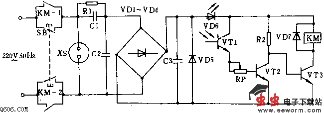 工作原理如图1所示。它是一个光控断电遥控装置,可以用于电简的光线进行触发。电路由两部分组成:一部分是光控电路;另一部分是受控电路。其中光控部分由光电三极管VT1、电位器RP相三极管VT2组成。受控部分由三极管VT3和继电器KM组成。按下按键开关SB时,稳压二极管vD5两端获得十l 2V的直流电压.发光二极管VI)6显示工作。由子vT1未受到手电简的照射,其vTl的c?之间为反偏电阻,vT2截止,vT2集电极为高电位,VT3饱和导通,继电器KM动作.触点KM—1tKM—2闭合,插座XS特有220V交流电源。当于电光照到VTl时,VTl的C-E间为反偏电阻,阻值变小使vT2导通,vT2集电极为低电位,vT3截止,继电器KM将释放,触点KM—1、KM—2断开,xs上电源则被切断。电阻Rl为电容C1提供泄放电流回路。vD7为保护二极管。