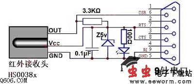 如图所示。该电路图简单到只有六个元件,而且可以直接去掉发光二极管(电源指示灯)和100Ω保护电阻以进一步简化电路。主要元件有 HS0038A红外遥控接收头、5V稳压管(1/4W)、发光二极管、9针串口插头、电阻(3.3KΩ和100Ω各一)、电解电容(0.1μF,10V以上)、万能印刷电路板、线材(至少3芯)以及电池盒(充当外壳)等一共不超过10元.