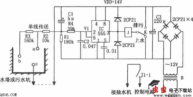 当控制器用于水塔上水时,若水位低于b点,则555因②脚电位为低电平而发生置位,3脚输出的高电平使继电器J吸合,触点J1-1接通,抽水机启动、上水。当水位升至a点时,555因⑥脚电位高于2/3VDD而发生复位,③脚输出的低电平使继电器J释放,触点J1-1断开,抽水机断电停转。从而使水位保持一定范围。当控制器用于排污时,若污水水位高于a点,则555因⑥脚电位为高电平而发生复位,③脚输出的低电平使继电器J吸合,控制排污电路工作,使污水水位下降。当水位降至b点以下时,555则因②脚电位为低电平而发生置位,3脚输出的高电平使继电器J释放,相应排污电路停止工作,从而使污水水位在a点以下。